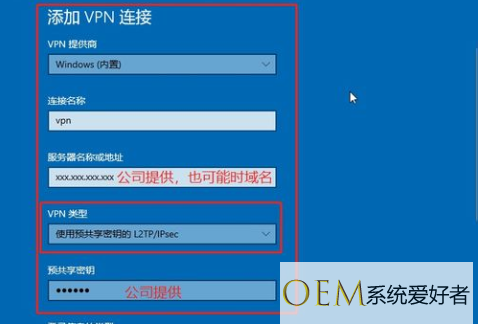 5.然后连接名称写"VPN"服务器名称由公司提供,共享密钥下填写公司提供的密钥填写完后,点击“保存”按钮。