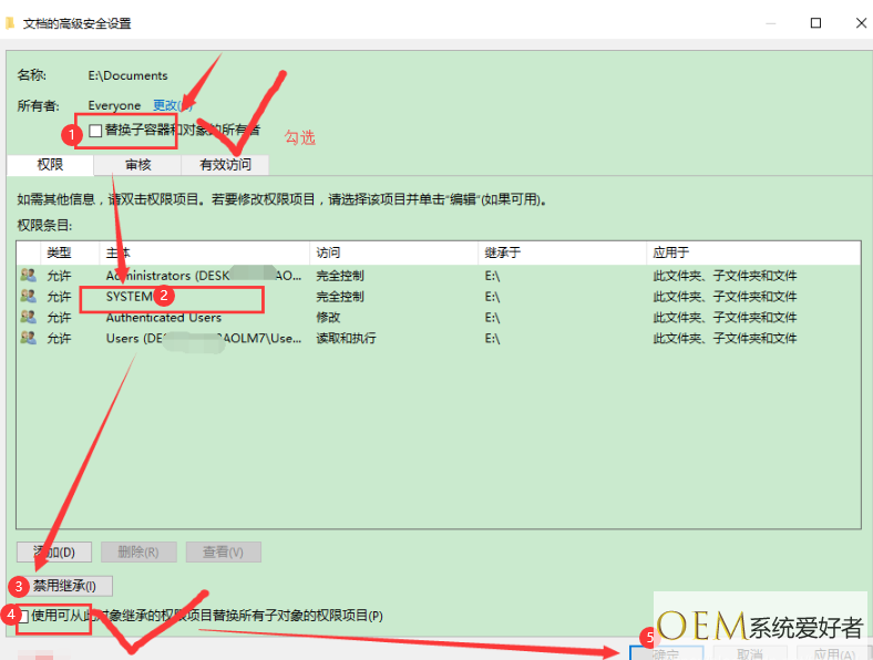 5.最后我们勾选“替换子容器和对象的所有者”,点击权限条目中的“SYSTEM”选择下方的“禁用继承”然后我们勾选“使用可从此对象继承的权限项目替换所有子对象的权限项目”选项,之后点击“确定”即可。