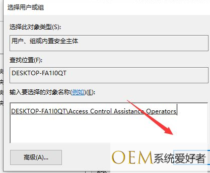 3、此时将打开“选择用户和组”窗口,在此输入“管理员账户”,同时点击“检测名称”按钮以确保当前所输入的管理员账户名正确,最后点击“确定”按钮。