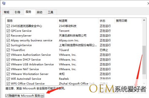 4.切换到服务选项,勾选上隐藏所有Microsoft服务,并点击全部禁用,然后重启电脑即可。如图所示: