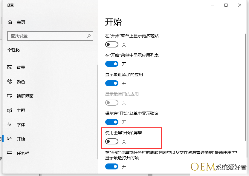 3.弹出右窗选项,找到使用全屏‘开始’屏幕选项,关闭。