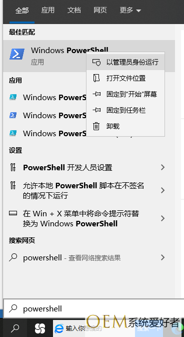 2、鼠标右键点击WindowsPowershell菜单项,在弹出来菜单中选择“以管理员身份运行”菜单项就可以,那样还可以打开Powershell对话框了。