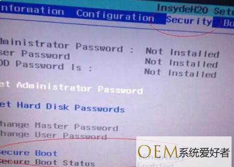 2.随后寻找并关掉secureboot选项,一般secureboot选项在“security”之中。