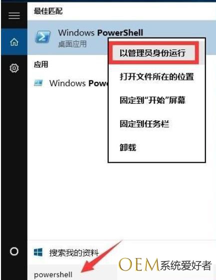 点一下桌面上左下方的“Cortana”视频语音输入框,键入“PowerShell”。并从百度搜索中寻找如图的专用工具并右键,从其右键菜单中挑选“以管理员身份运作”项。