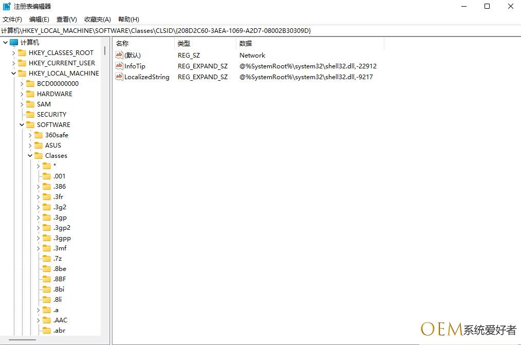 精准定位到:HKEY_LOCAL_MACHINESOFTWAREClassesCLSID{208D2C60-3AEA-1069-A2D7-08002B30309D}