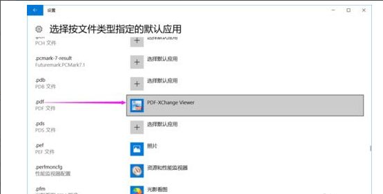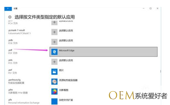 6、在“选择按文件类型指定的默认应用”菜单栏中,我们可以看到不同文件类型打部分都指定了默认的应用程序,我们下拉找到.pdf的默认程序,发现其默认应用为Microsoft edge;