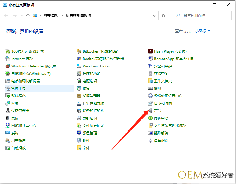 3、在确保设备完好情况下需要对电脑进行设置,首先打开“控制面板”,点击“声音”。