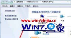 2、在网络和共享中心设置窗口中找到图示箭头指向处的“windows防火墙”;