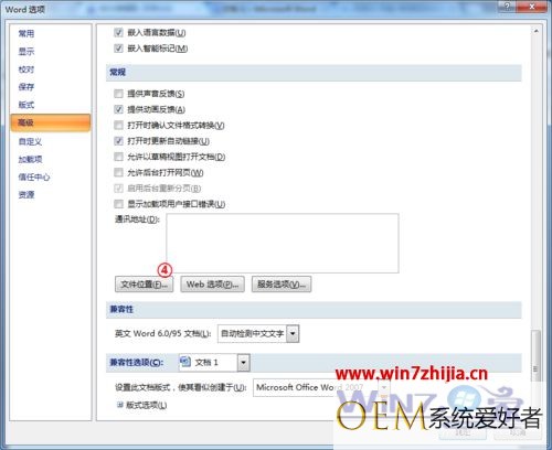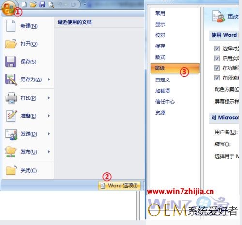 2、点击左上角的office图标,选择“word选项”,在弹出的对话框选择“高级”选项卡;