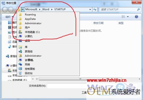 5、点击路径栏的“《”,可显示完整路径。这个文件夹就是word启动时启用加载项的地方。到资源管理器中按图索骥找到它;