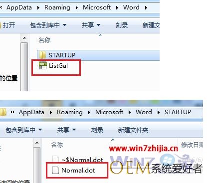 8、打开一台能正常显示word“加载项”的电脑,也按上述方法找到对应的路径,会发现在word文件夹下还有一个“listgal”文件;在“starup”文件夹下还有一个“Normal.dot”文件(也可能有其他的,但至少应该有这两个);