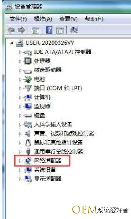 2、找到“设备管理器”并选择,在设备管理器的界面下方找到“网络适配器”选项。