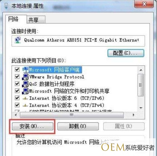 2、进来之后选择本地连接,鼠标右键选择鼠标,进入到属性对话框,在其下方点击“安装”选项。