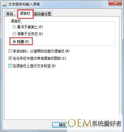 4、在新的窗口中选择语言栏选项卡,将语言栏的状态从隐藏改为停靠于任务栏。