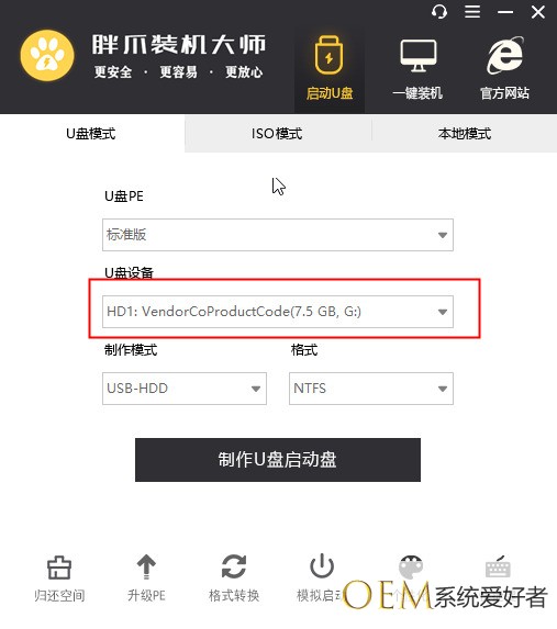 3.打开胖爪装机大师以后,插入准备好的u盘,保证软件可以识别到u盘信息(如图五);