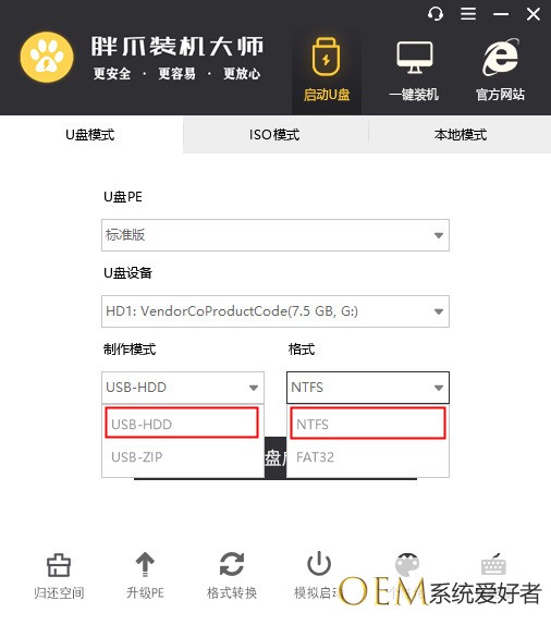 4.在制作模式中选择usbhdd,格式中选择ntfs(如图六),接着制作u盘启动盘(如图七);
