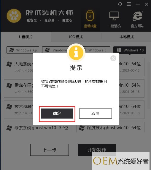 6.注意:软件会将u盘格式化,制作成pe启动器。要确认u盘中无重要资料,点击确定(如图十);