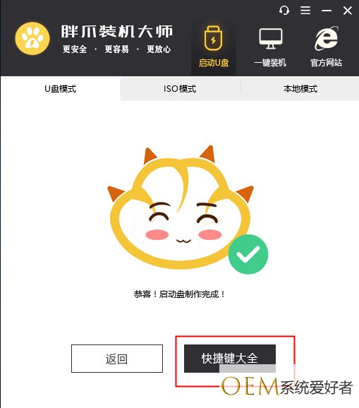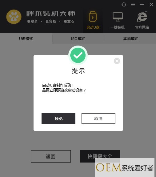 8.u盘pe工具制作完成以后,系统会有相应的提示(如图十一),点击取消即可;如果您想先模拟pe启动,可以通过预览,并且根据引导进行操作,随时可以关闭(不会损伤电脑)。在开始升级win7之前,确认当前电脑进入bios页面的快捷键,点击快捷键大全即可查看(如图十二);
