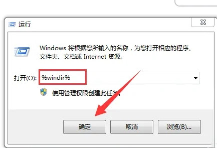 4.然后我们返回到运行窗口,输入%windir%后点击【确定】。