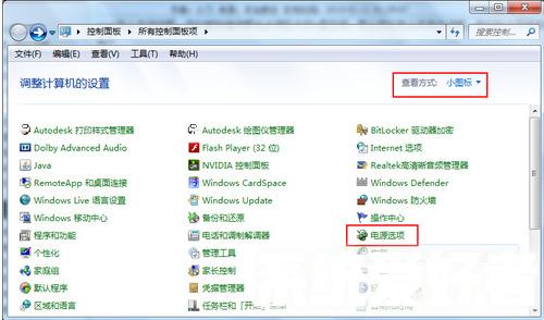 1、点开始-控制面板,打开Win7控制面板,找到“电源选项”并打开: