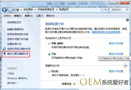 2、在电源选项窗口中点“更改计算机睡眠时间”打开对应的设置页面。