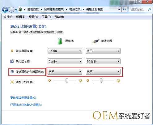 3、在“使计算机进入睡眠状态”一栏两个设置中,选择“从不”,然后点“保存修改”按钮保存设置。