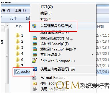 2、另存为任意文件名.bat文件,比如关闭休眠.bat和开启休眠.bat,下图以aa.bat为例。补充说明:运行bat批处理文件需以管理员身份运行。