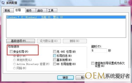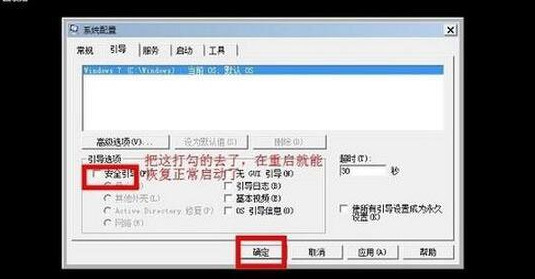 4、待完成有关“安全模式”下的相关操作之后,我们还需要在“安全模式”界面中清除“安全引导”选项,