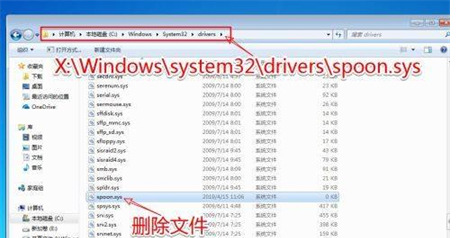 2、打开资源管理器,按照以下找到路径:X:Windowssystem32driversspoon.sys(X盘指的是安装的系统盘,通常为C盘),选中“spoon.sys”文件,按下键盘的Delete键删除文件即可。