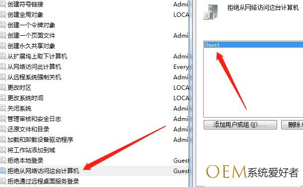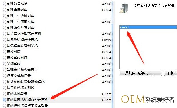 7、展开分配用户权限,找到‘拒绝从网络访问此计算机’,然后把Guest用户删除。