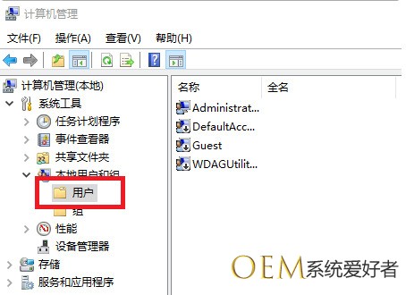 2、然后在计算机管理界面点击“用户”打开。