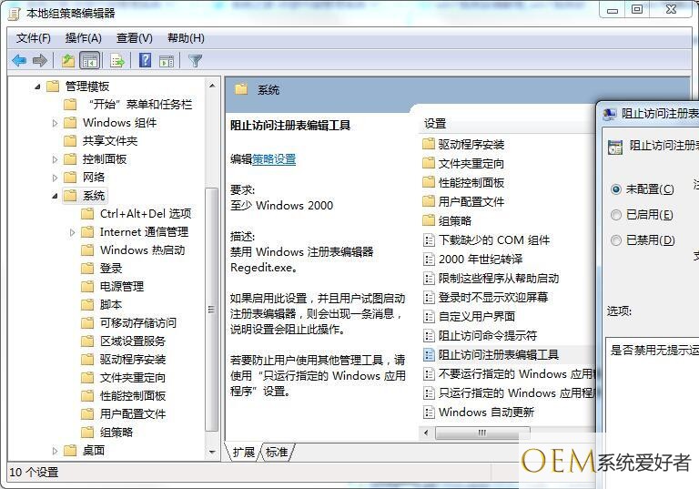 2、访问:“用户配置”→“管理模块”→“系统”→“阻止访问注册表编辑工具”,双击打开有三个选项可选,未配置、已启用、已禁用,这里我们选择“未配置”或“已禁用”;3