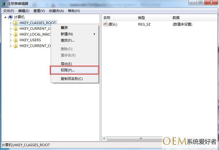 4、在没有创建建值权限的注册表大类上单击右键→选择“权限”,在新弹出的权限设置窗口,点击“高级”;