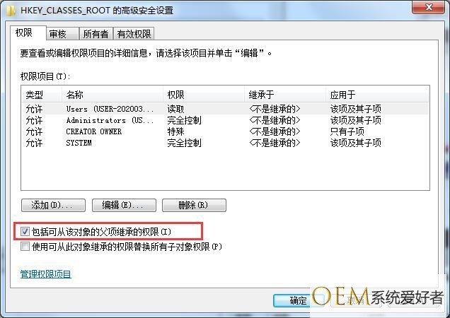 5、在高级权限设置中,我们要去掉勾选“包括可从该对象的父项继承的权限”,然后确定“保存”即可;