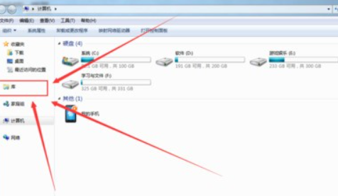 1. 点击电脑桌面上的“计算机”图标,打开计算机。在左侧导航栏中找到“库”选项,如下图所示。