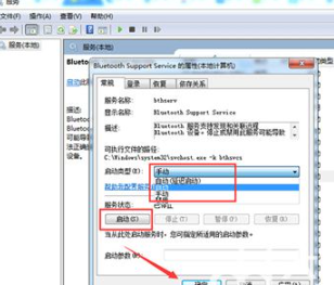3. 在“BluetoothSupportService”属性的常规界面中,将“启动类型”设置为自动,在“服务状态”中点击“启动”;