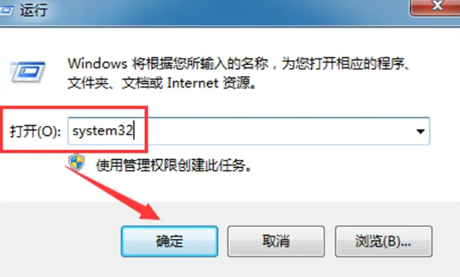 1.按下【Win+R】组合键,打开“运行”界面,在其中输入“system32”,并点击“确定”;