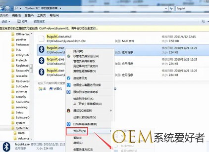 2.在搜索框中输入“fsquirt”,在“system32”文件夹中找到应用程序“fsquirt.exe”,右键点击该文件,选择“发送到”-“桌面快捷方式”;