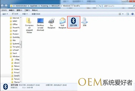 3.在【开始】菜单栏中搜索“shell:sendto”,打开所在文件夹,然后将桌面上的“fsquirt.exe”应用程序添加到文件夹中,并将其重命名为“蓝牙设备”。