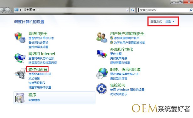 2.进入控制面板后,点击硬件和声音,查看方式为类别。