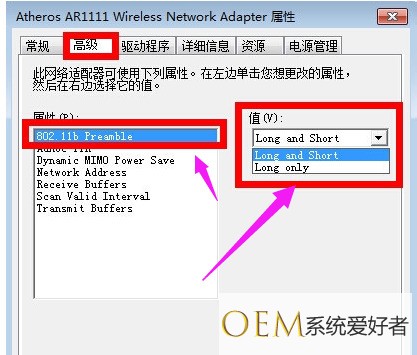 5.双击进入之后找到”高级“的选项。找到”802.11“的选项,在右手边有一个”值“,我的电脑只有两个选择”Long only“或者”Long and Short“,我这里选的是”Long and Short“。