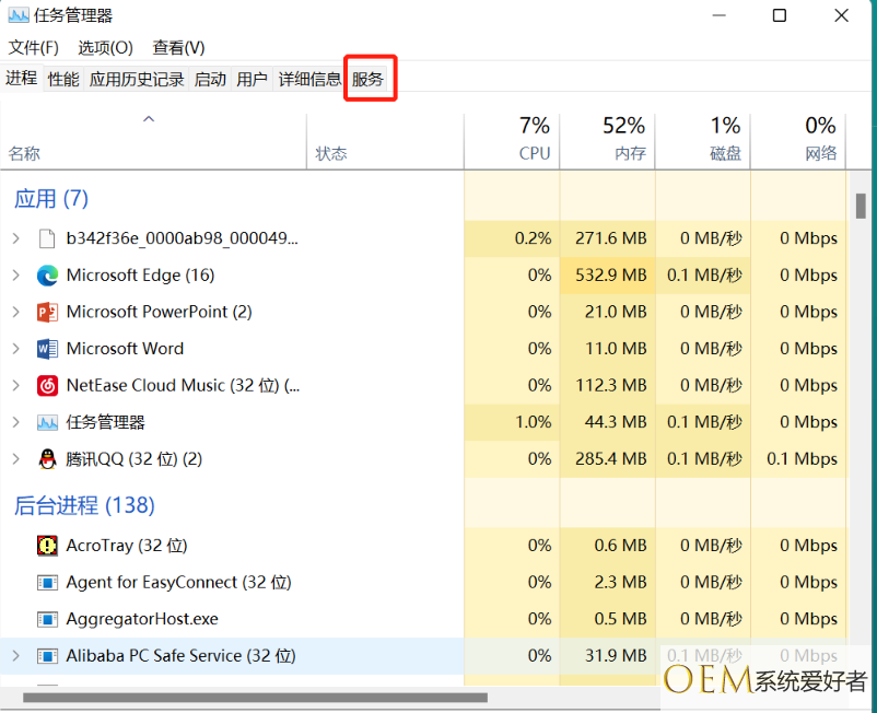 1、按下键盘ctrl +shift +esc 打开任务管理器,打开后点击上方的“服务”选项。