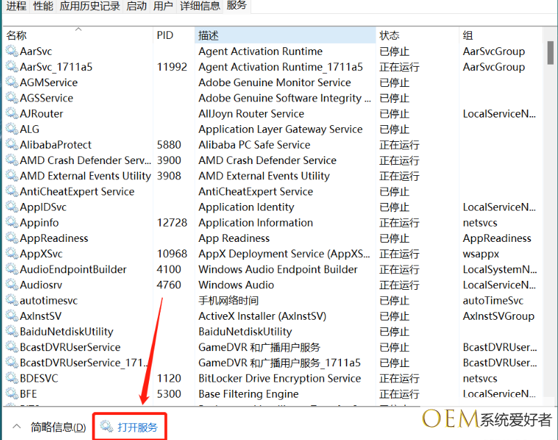 1、打开任务管理器,进入服务界面;