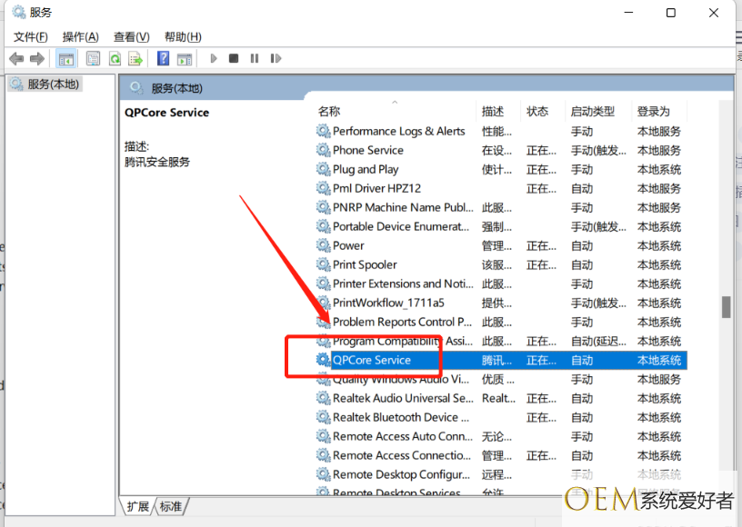 2、打开“QPCore Service”的属性,修改启动类型;