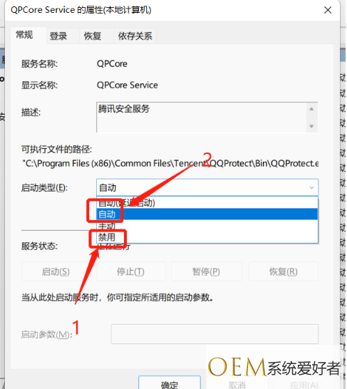 4.、在常规选项卡下,将启动类型改为“禁用”,点击应用后再改为“自动”,重启一下QQ,就能解决win11打不开qq的问题了。