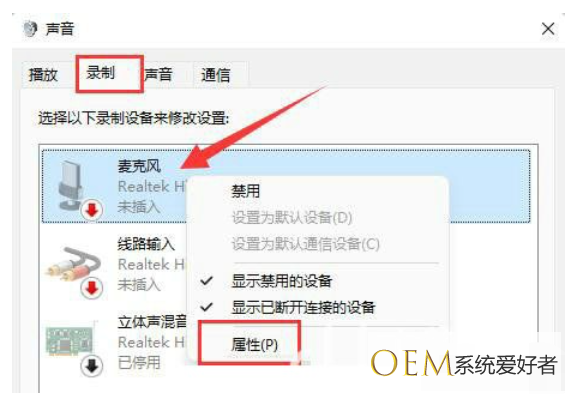 4、然后进入“录制”,右键麦克风,点击进入“属性”面板。