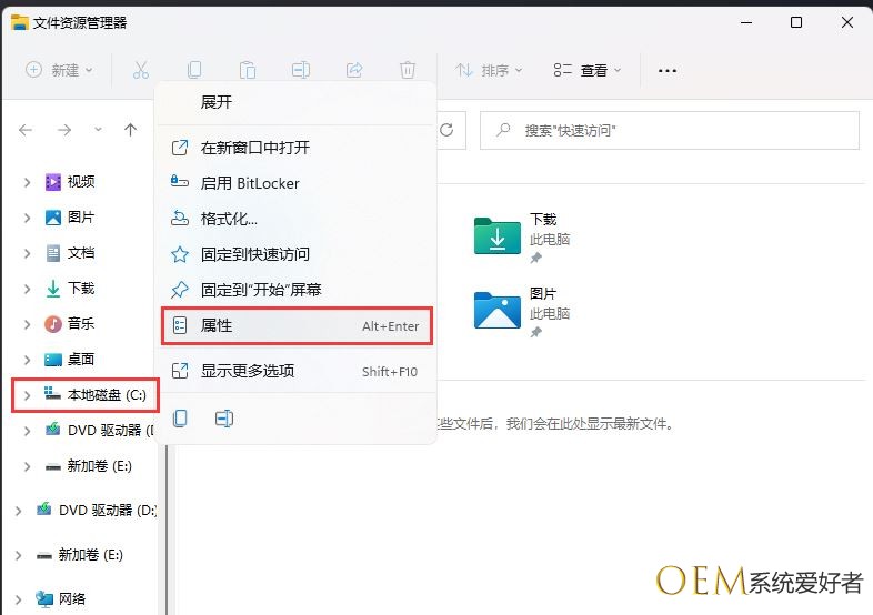 2、文件资源管理器右侧边栏,找到边右键点击本地磁盘(c:),在打开菜单项中,选择属性;