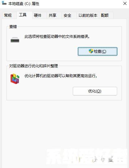 3、本地磁盘(c:)属性窗口,切换到工具选项卡,然后点击查错(此选项将检查驱动器中文件系统错误)下检查;