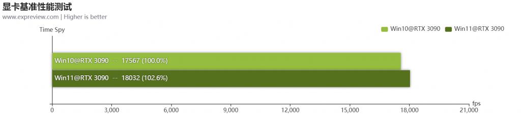 首先我们使用 3DMark 做一个简单显卡基准性能测试,可以看到 Time Spy 里,Windows 11 三次成绩分别是 18246、18052 和 17798(三次平均为 18032),而 Windows 10 里三次成绩分别是 17618、17582 和 17500(三次平均为 17567),Windows 11 略微高出,但差距并不大。3DMark 有多个测试项目,Time Spy 是显卡在 DirectX 12 游戏中,2K 分辨率性能指数。显卡基准性能测试并不是这次测试重点,只是作为一个参考。