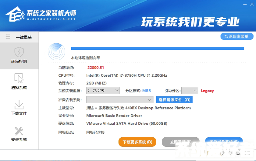 3、进入页面后,软件会自动检测我们电脑当前状态,等待系统检测完毕后,点击【下载更多系统】。